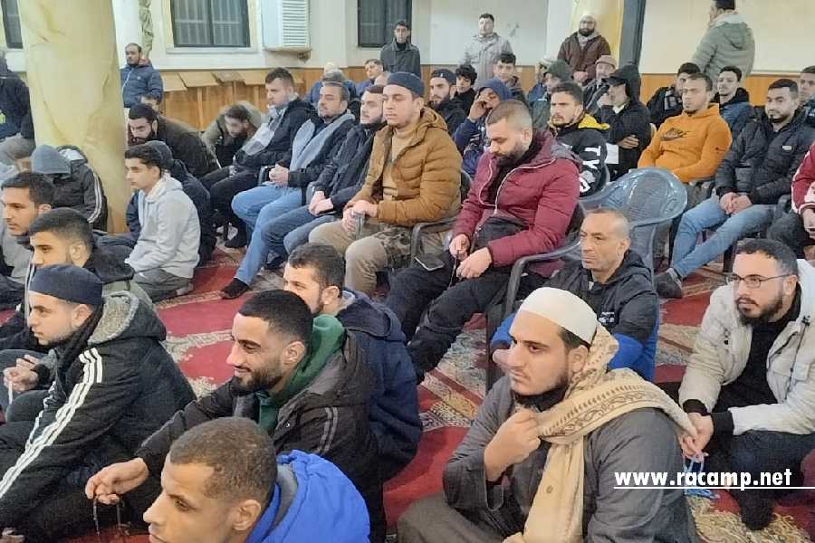 بمناسبة ذكرى المعجزة النبوية الخالدة “الإسراء والمعراج”، وبدعوةٍ كريمة من مسجد ومجمع زمزم، شهد المخيم مجلساً علمياً وإيمانياً مهيباً، خُصص لقراءة وشرح أحاديث الذكرى العطرة من كتاب “حُجةُ الله على العالمين” للشيخ العلامة يوسف بن إسماعيل النبهاني “رحمه الله”.