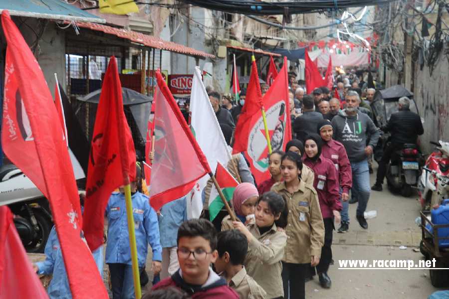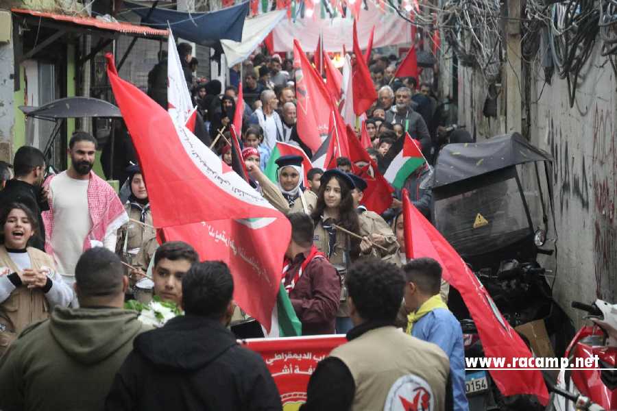 على وقع الأناشيد الثورية، أوقدت الشعلة لتنطلق مسيرة مهيبة تقدمتها الفرق الكشفية وحملة الأكاليل، حيث تعانقت الأعلام الفلسطينية برايات الجبهة الحمراء. وجابت المسيرة شوارع مخيم شاتيلا وصولاً إلى مقبرة الشهداء، حيث وضع المشاركون إكليلاً من الزهور على الأضرحة، معاهدين الشهداء على الاستمرار حتى العودة وتقرير المصير وإقامة الدولة وعاصمتها القدس.